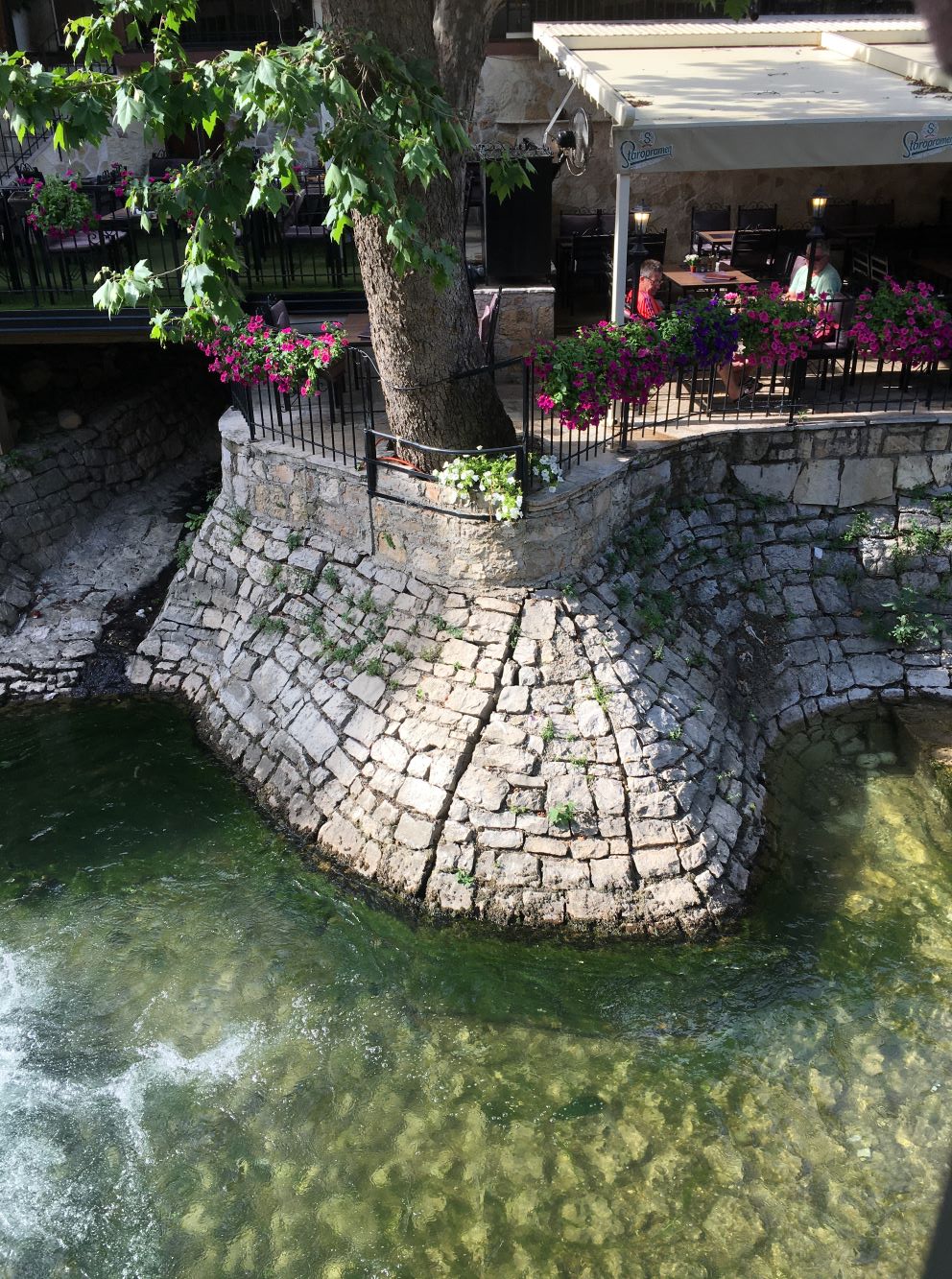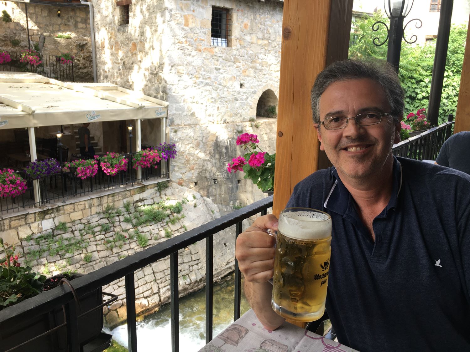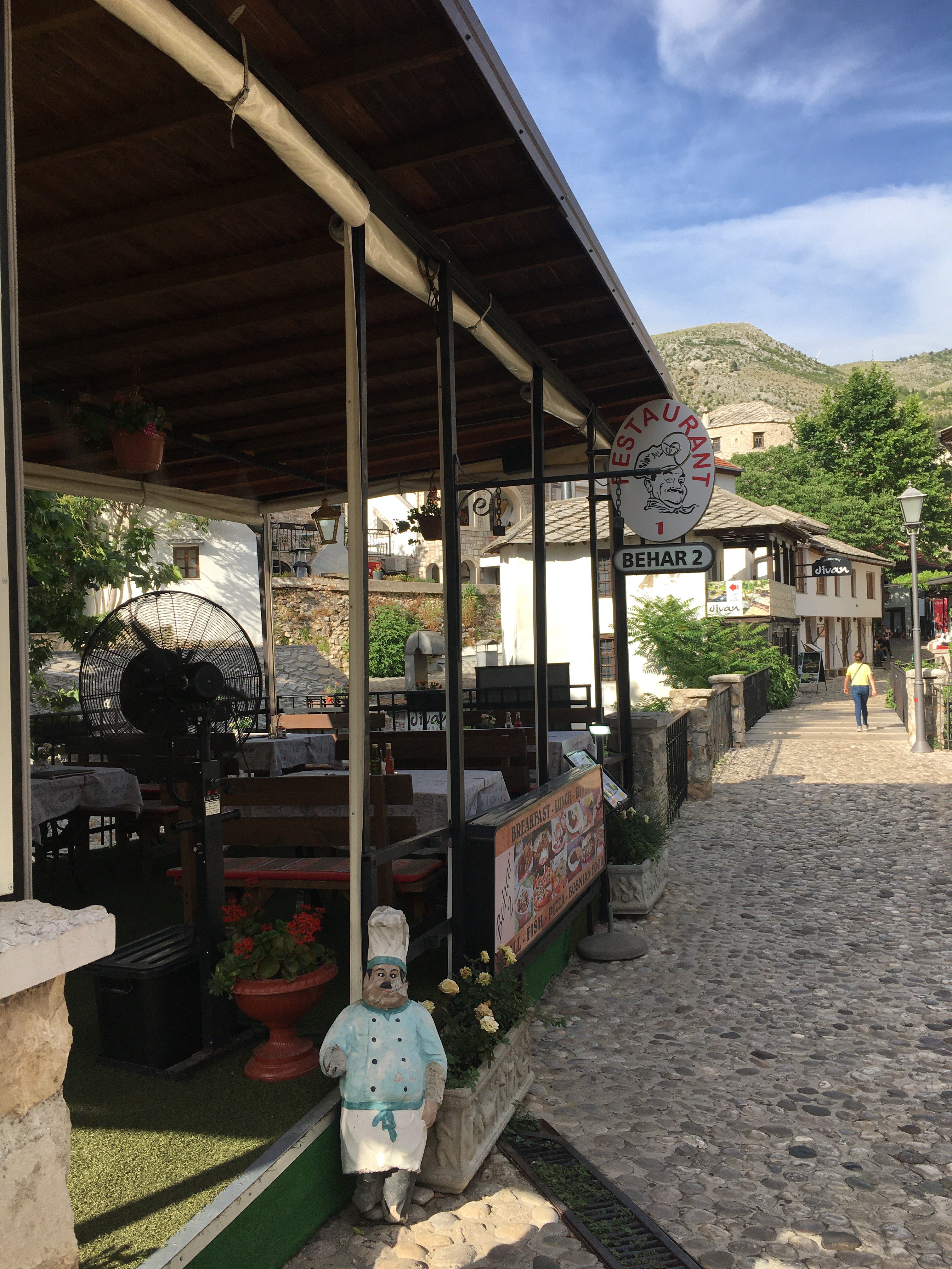 O Divan tem localização privilegiada, bem ao lado do rio Radobolja. A vista é genial e vale muito a pena. Fomos para o jantar e, calor danado, pedimos uma grande e deliciosa salada caprese e o pileći fileti (um filé de frango ao molho de champignons). Pra acompanhar, uma garrafa do vinho da casa. Delicioso!