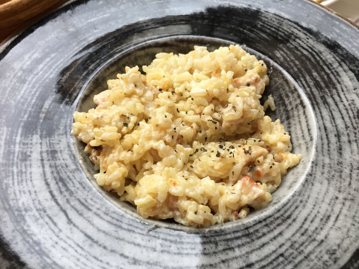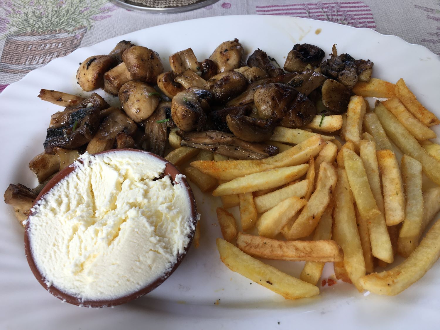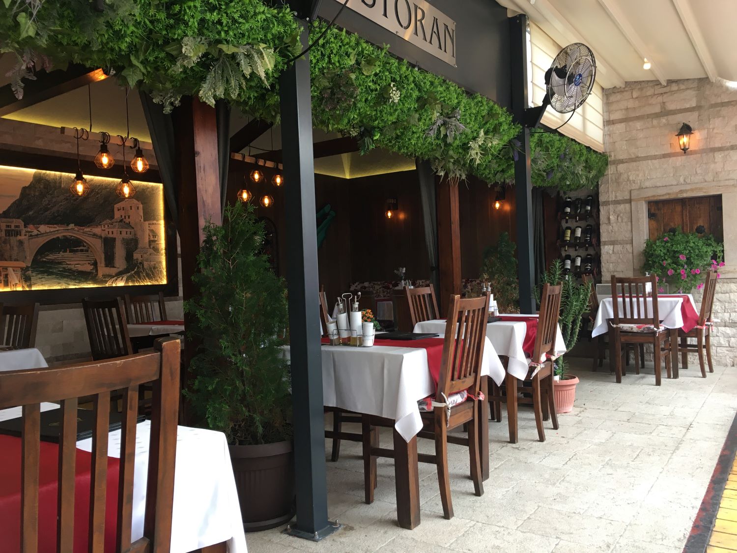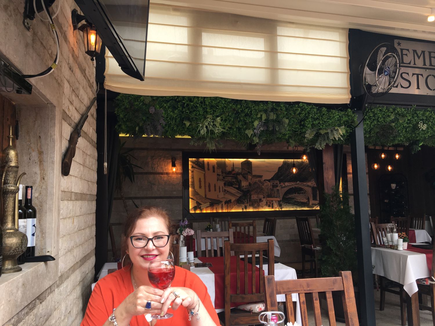 O Divan tem localização privilegiada, bem ao lado do rio Radobolja. A vista é genial e vale muito a pena. Fomos para o jantar e, calor danado, pedimos uma grande e deliciosa salada caprese e o pileći fileti (um filé de frango ao molho de champignons). Pra acompanhar, uma garrafa do vinho da casa. Delicioso!