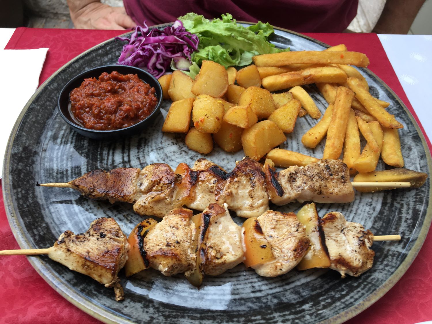 Nosso primeiro almoço, logo ao chegar, foi justamente no restaurante do hotel. Já passava das 14:00 e estávamos com muita fome. Espetinhos de frango, batatas, um arrozinho temperado e uma salada de tomate, pepino e queijo. Pra beber, um ice-tea de cereja (amo cereja!).