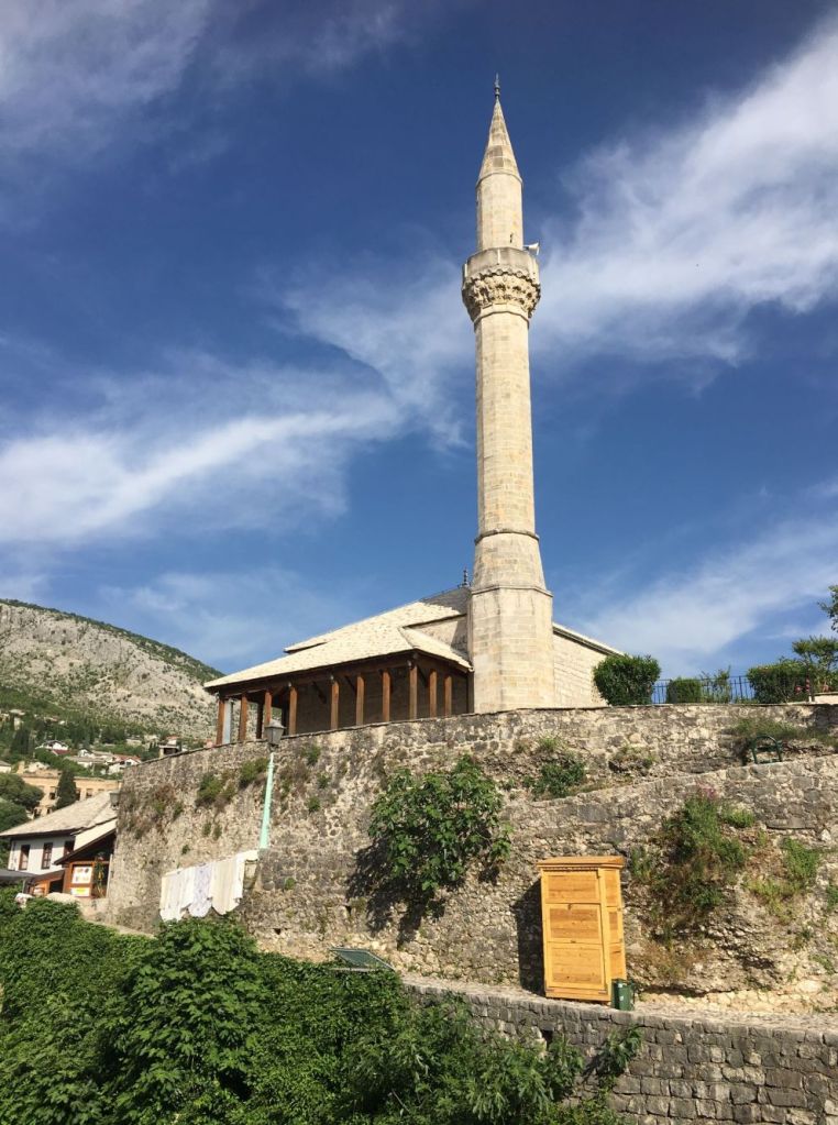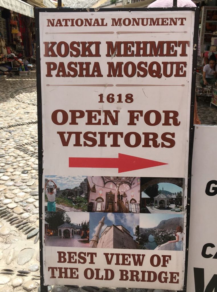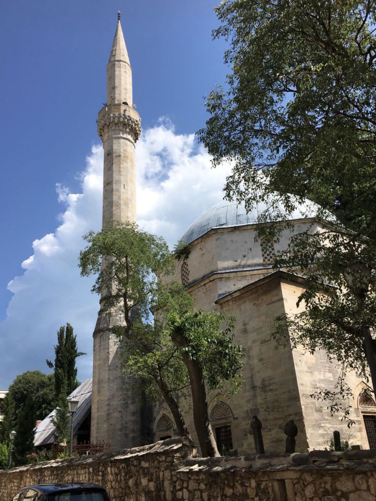 A Mesquita Pasha é um dos monumentos nacionais da Bósnia. Ela é de 1617 e fica na Mala Tepa, 16, às margens do rio Neretva, rodeada de lojas e pelo Bazar. Não há muita informação histórica sobre o edifício, pois ele foi renovado vária vezes ao logo dos anos até ser praticamente reconstruído em 2001 com o apoio da comunidade islâmica da Turquia. É de lá que se tem a melhor vista da Ponte Velha – tiramos inúmeras fotos dali. Pode-se subir à torre, mas paga-se separado. A entrada é pela rua do bazar.