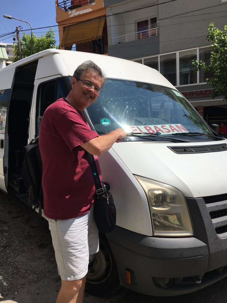 Descobrimos que o único ônibus que nos levaria mais perto da Macedônia não era um ônibus, mas uma minivan, que ia para Elbasan, no meio da Albânia. Ela saía às 11:30 de Sarandë, levava 5h30 e custava 1500 lekes (R$90) por pessoa. Segundo o Sr. Ariam, o motorista, quando chegássemos lá ele ligaria para alguém que faria o resto do trajeto conosco até Ohrid. No final, o próprio Sr. Ariam se ofereceu para nos levar até Kjafasan, na fronteira da Macedônia. Então, depois que todos os passageiros desceram, fomos até a casa dele, onde deixou a van e pegou seu carro, além da esposa e do filho pequeno, que viajaram conosco para visitar parentes.