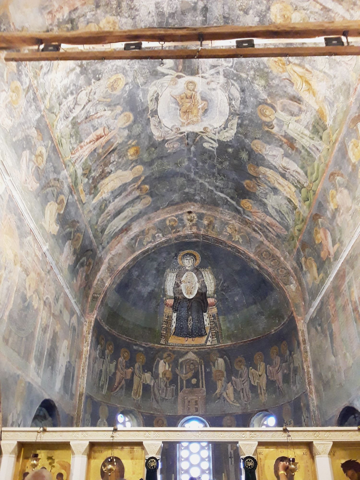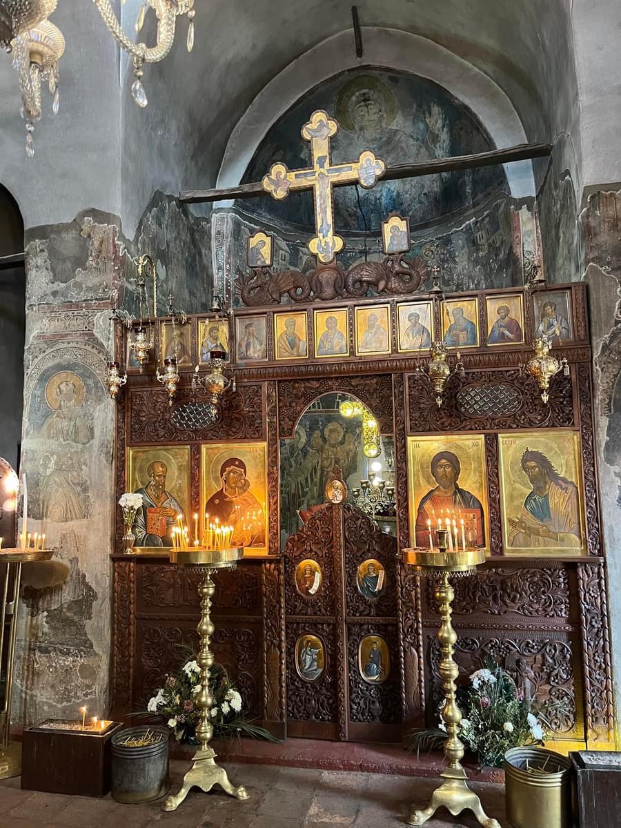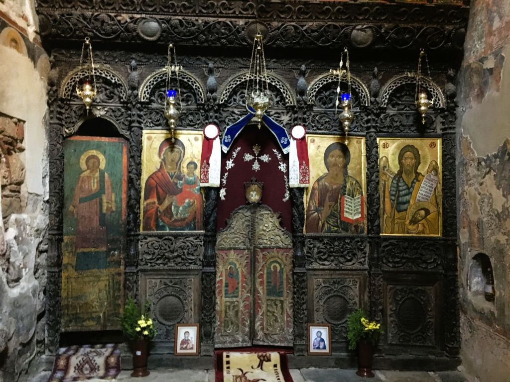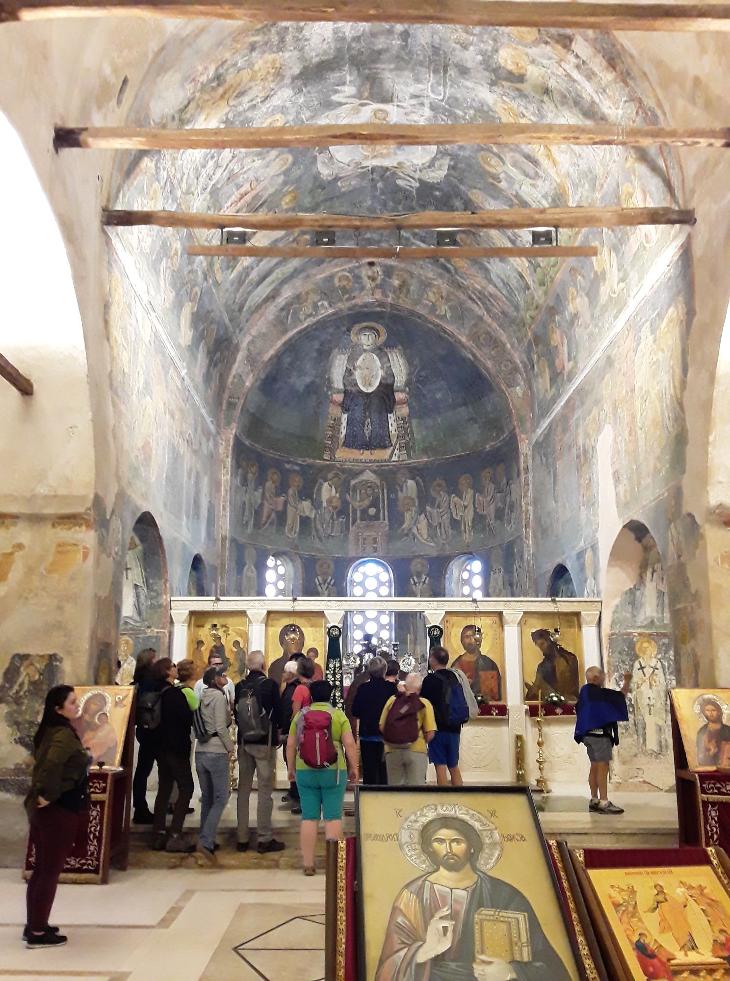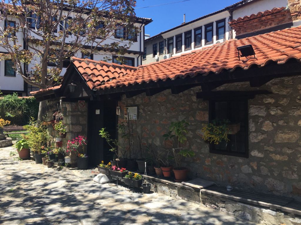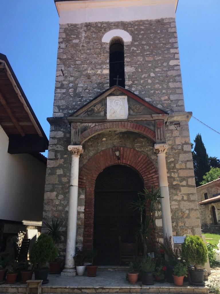 Logo ao lado fica a Sveta Bogorodica Bolnička. Nem mesmo a Sveta Sofija, que é de 1035, nos impressionou tanto quando essa singela capela de apenas uma nave. Ela foi construída por Jakov, o fundador e abade do mosteiro de Clement. Sabe-se que os afrescos foram pintados entre 1368 e 1370, o que significa que ela é ainda anterior. O iconastasis é de 1833 e um dos mais belos exemplos da escultura em madeira de Ohrid. Uma lindeza que conta um pouco da história do povo do lugar.