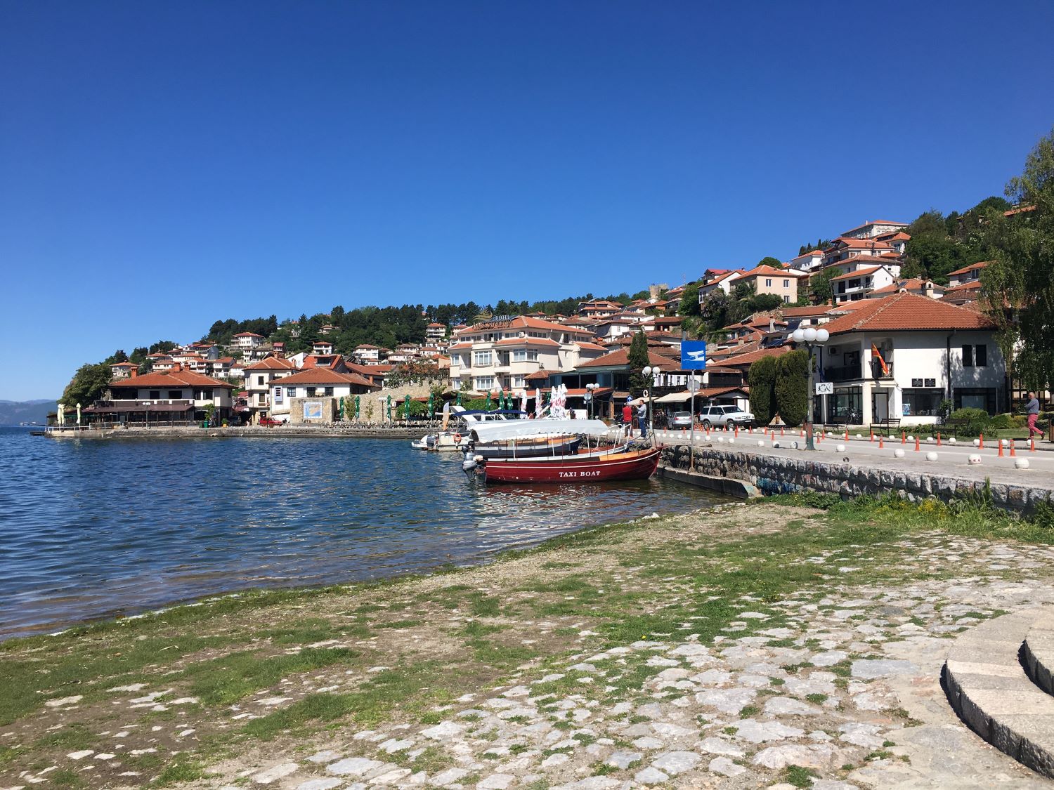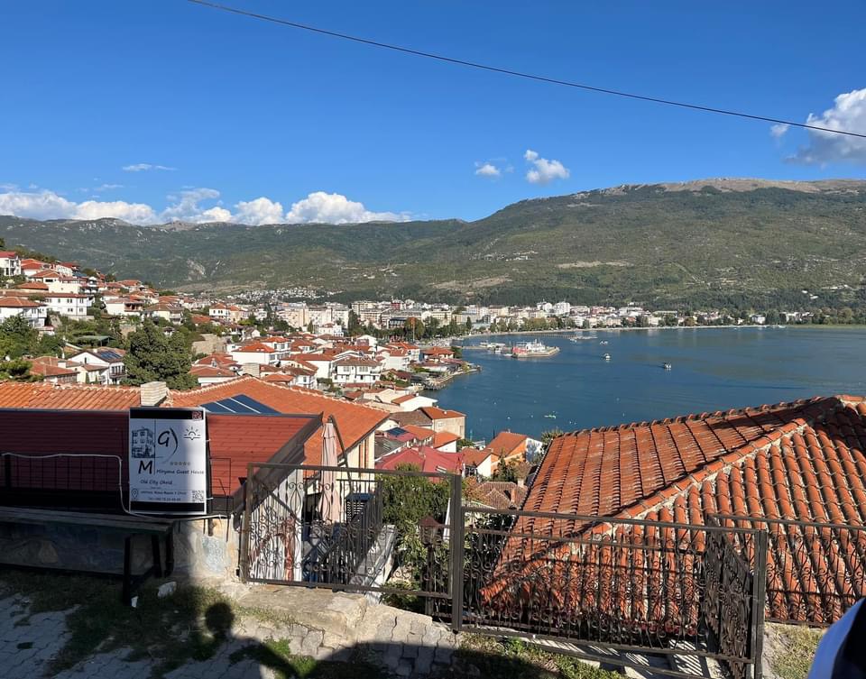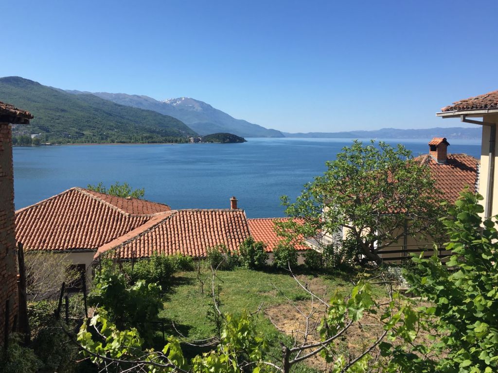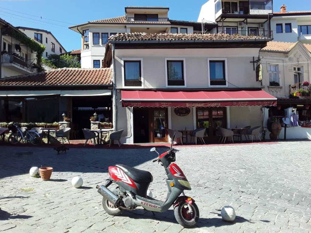 Pagamos mais 6000 lekes (cerca de R$370), para um trajeto de 1h30, mas chegando na fronteira, ele já tinha negociado para outro táxi nos esperar. Então fizemos a alfândega, já dentro do carro com o Sr. Agram, que nos deixou na porta do nosso hotel na cidade velha de Ohrid. Detalhe, o Sr. Ariam não falava inglês! Mesmo assim nos comunicamos com um pouquinho de italiano (que ele entendia bem e a gente falava mal) e muita boa vontade.