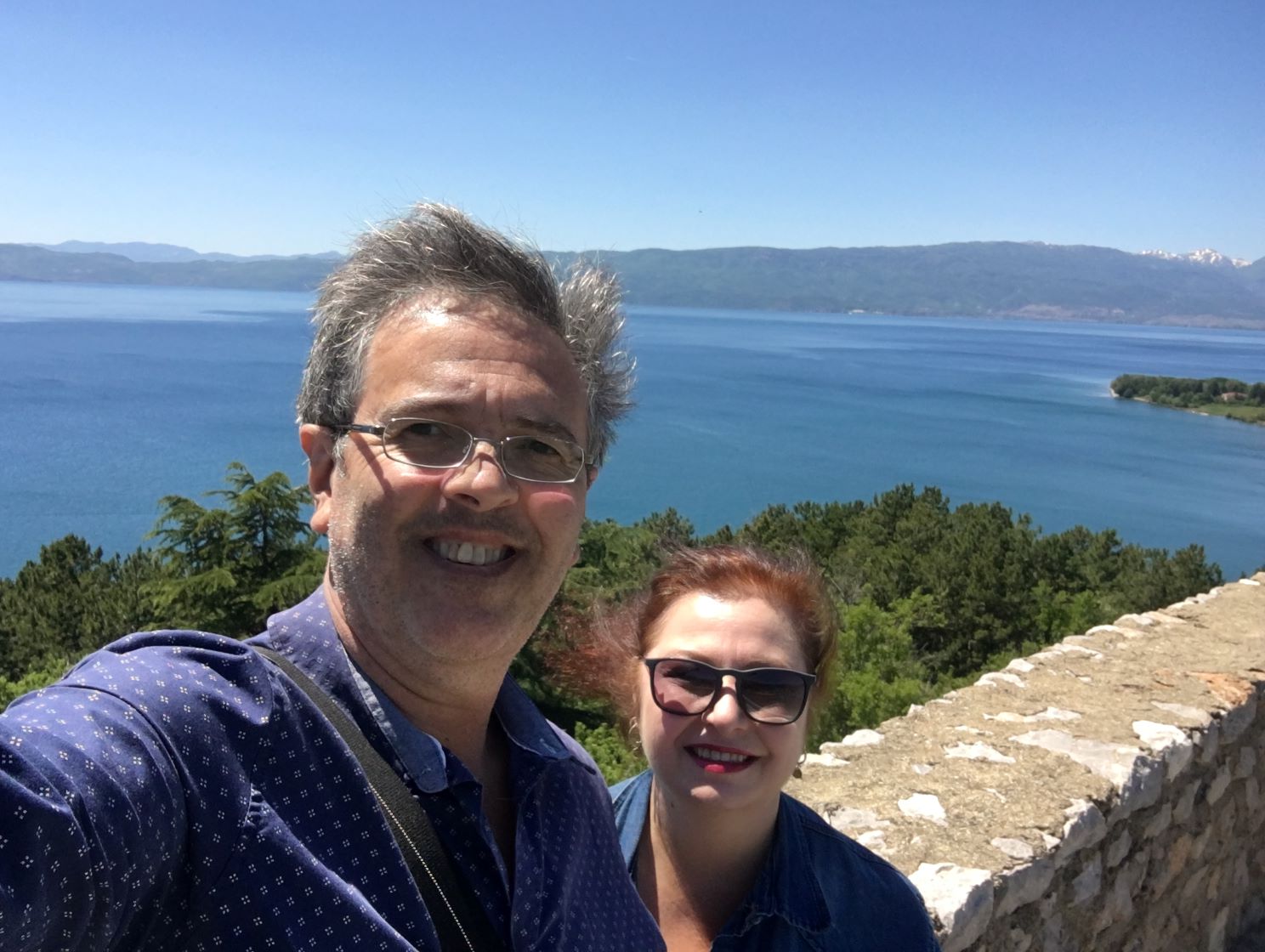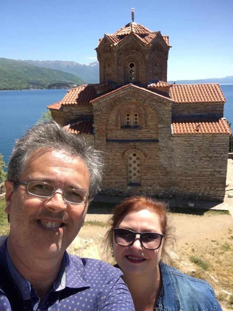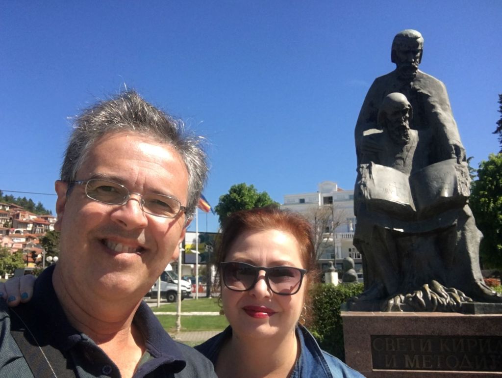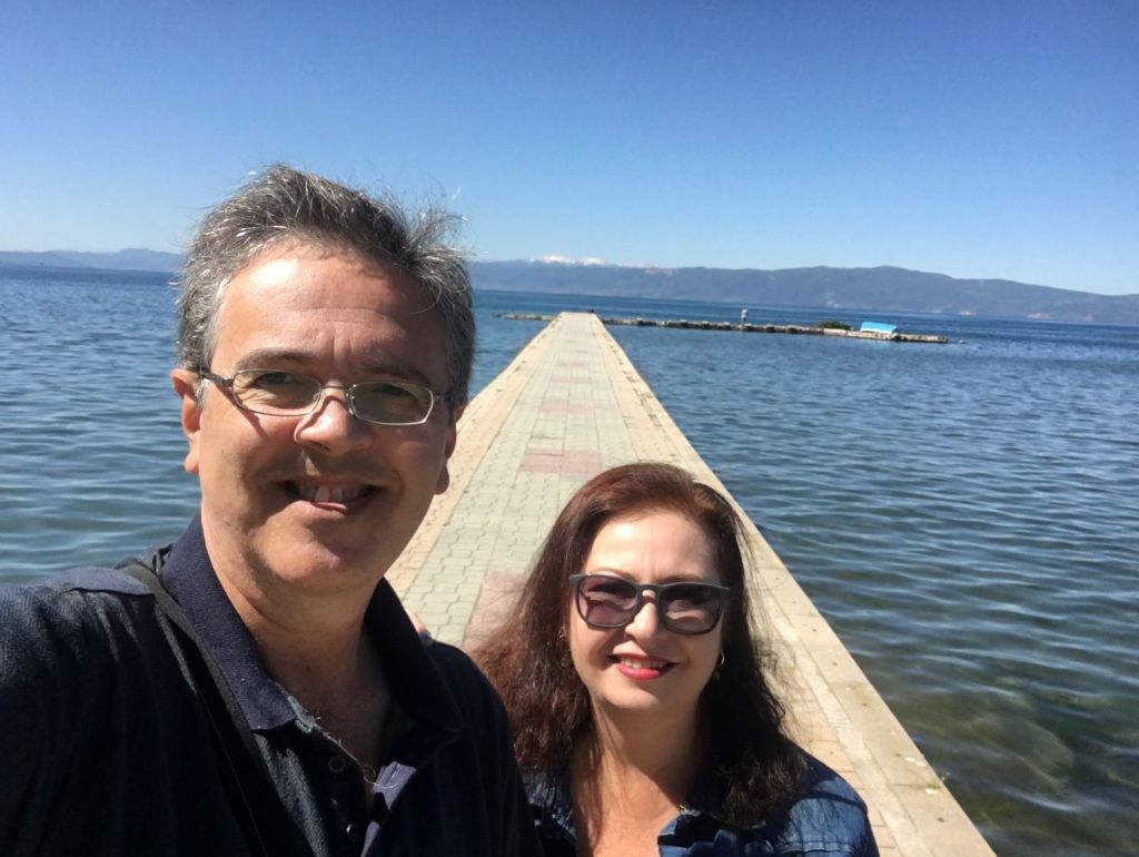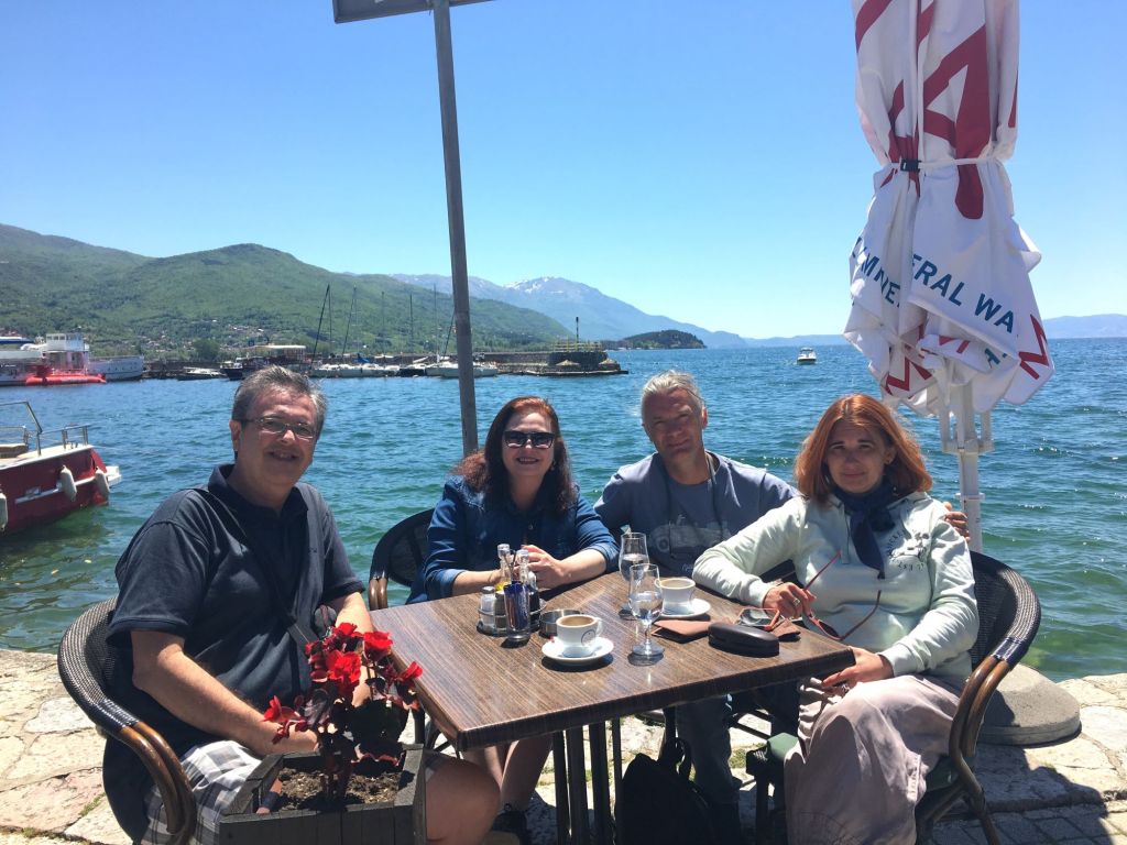 No café da manhã do hotel conhecemos o Robert e a Iwona, polacos que vivem em Londres há 15 anos e também gostam de viajar. Nos encontramos de novo no Castelo e depois no pátio da Igreja da Mãe de Deus Peribleptos. Quando topamos com eles mais uma vez, em frente ao lago Ohrid, paramos para tomar um café e conversar. E foi muito legal! O tempo passou que nem vimos. Marcamos então de jantar juntos.