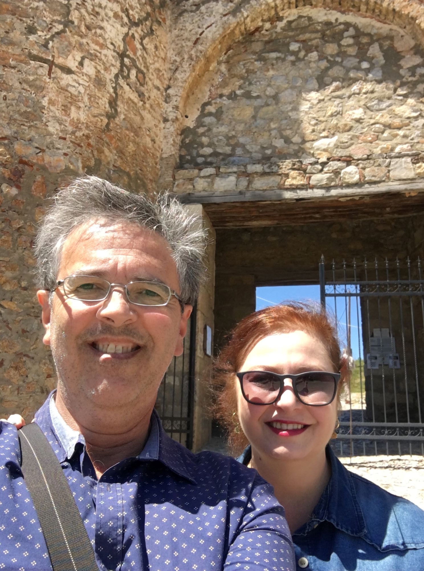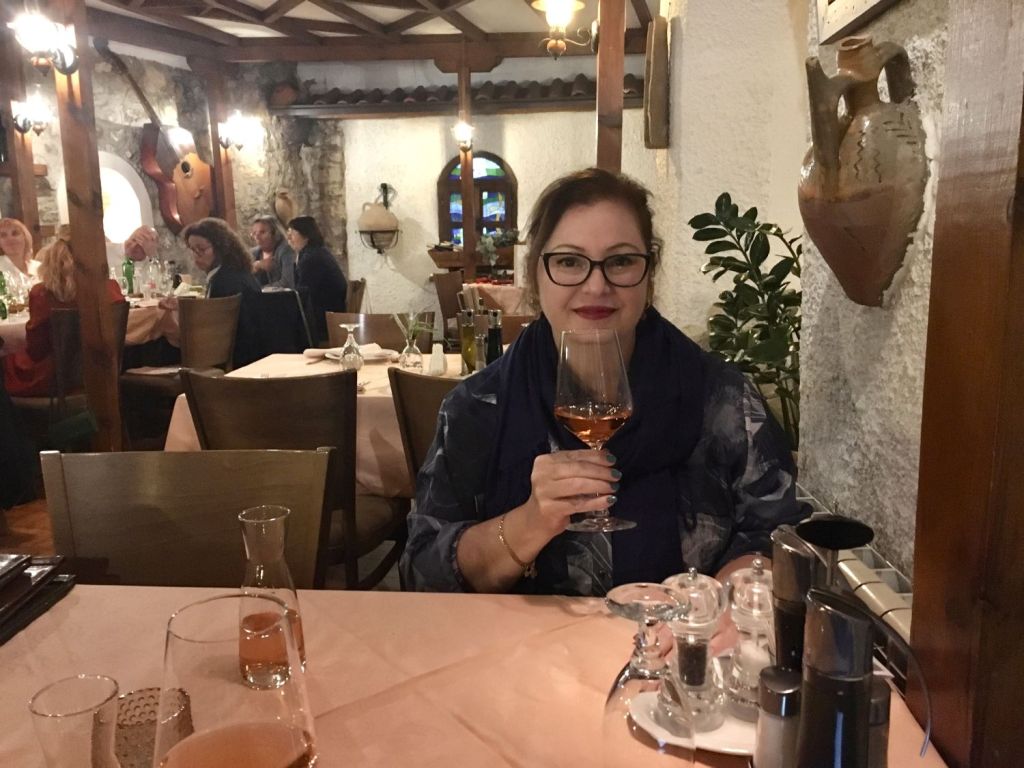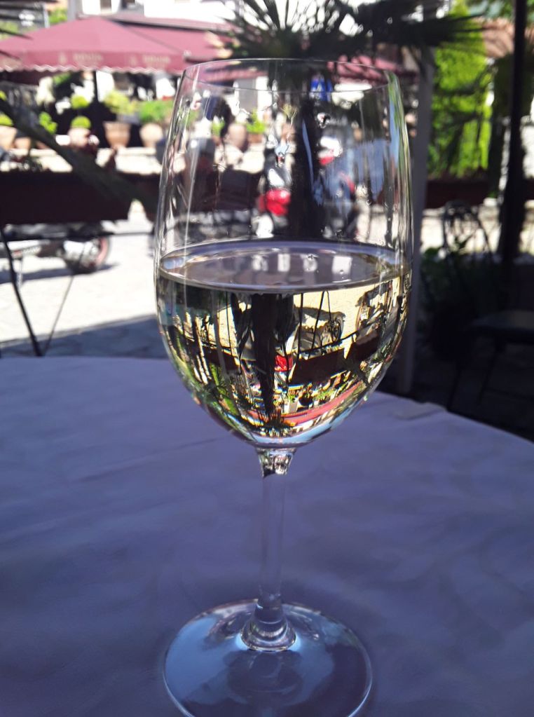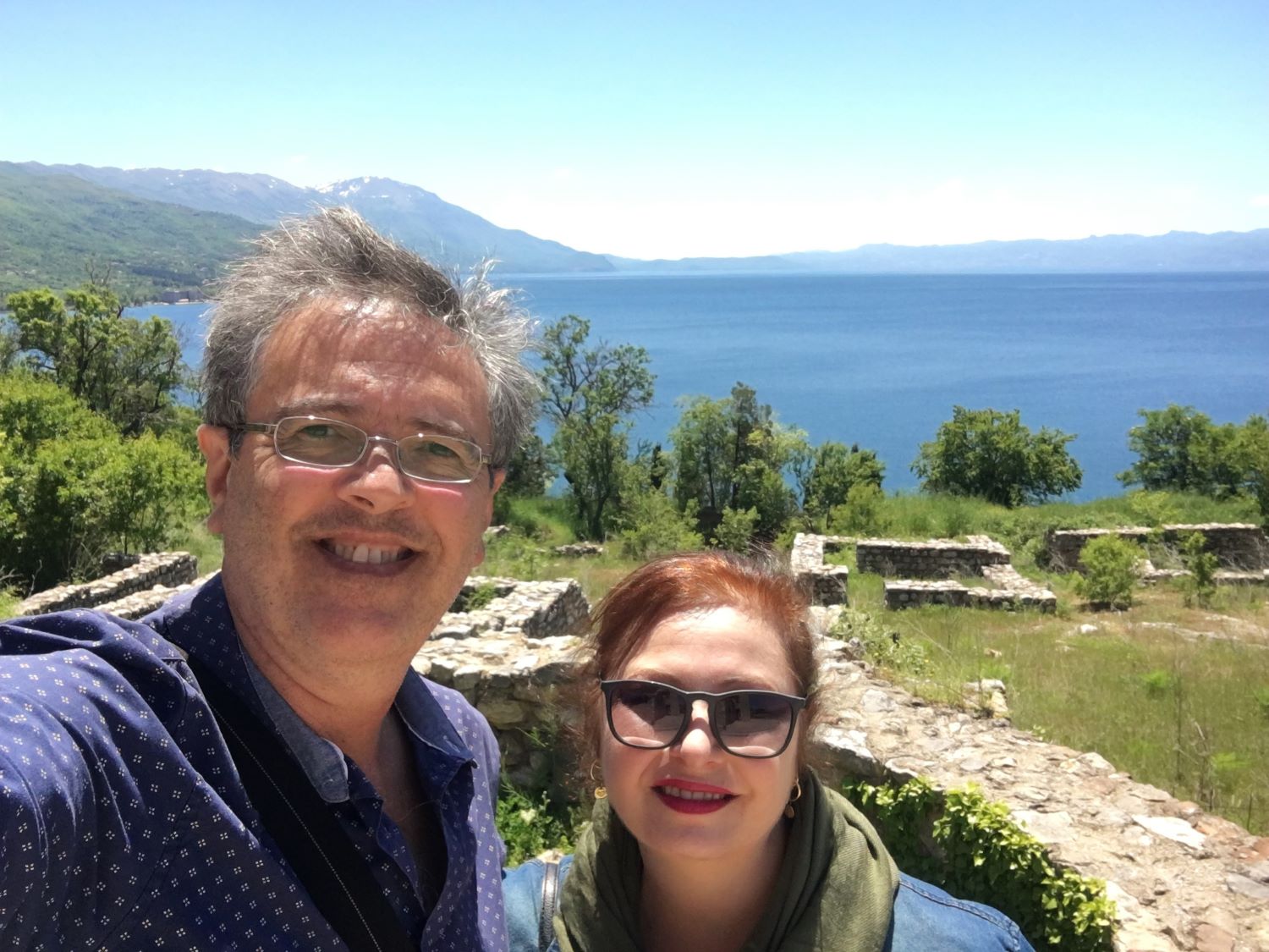 No café da manhã do hotel conhecemos o Robert e a Iwona, polacos que vivem em Londres há 15 anos e também gostam de viajar. Nos encontramos de novo no Castelo e depois no pátio da Igreja da Mãe de Deus Peribleptos. Quando topamos com eles mais uma vez, em frente ao lago Ohrid, paramos para tomar um café e conversar. E foi muito legal! O tempo passou que nem vimos. Marcamos então de jantar juntos.
