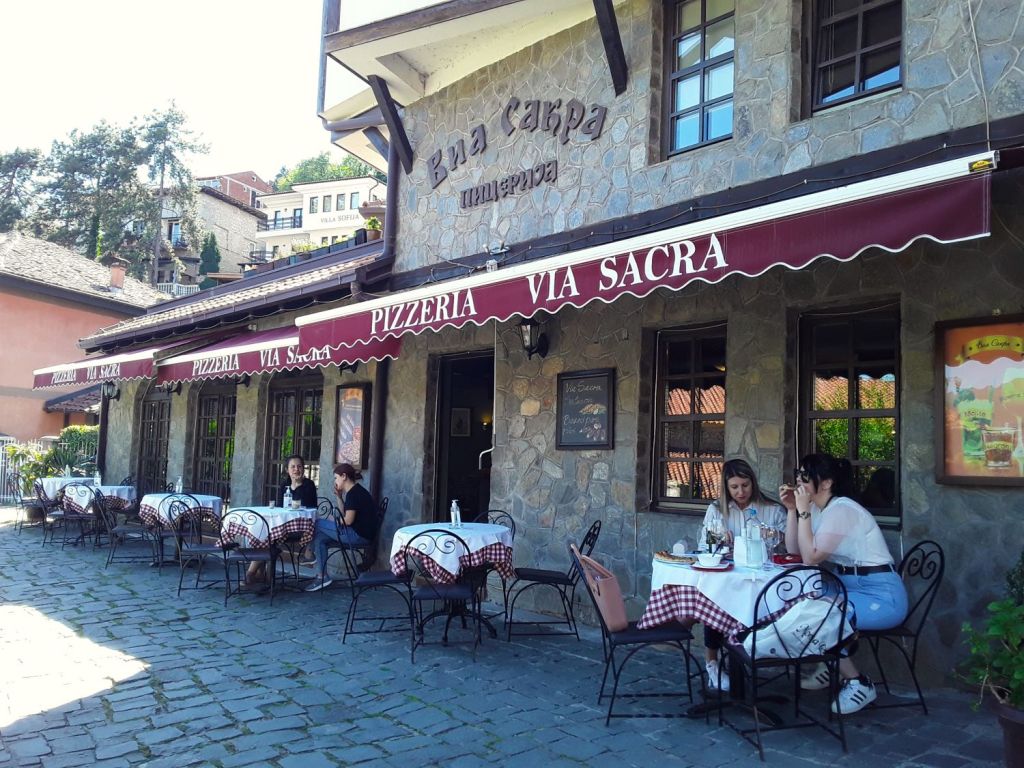 Quase em frente à Sveta Sofija (e do restaurante de mesmo nome) fica a Pizzaria Via Sacra, com mesinhas ao ar livre. Almoçamos lá em nosso 2º dia, depois de visitar a igreja. Pizza, salada e um vinhozinho gelado. Ótima pedida.