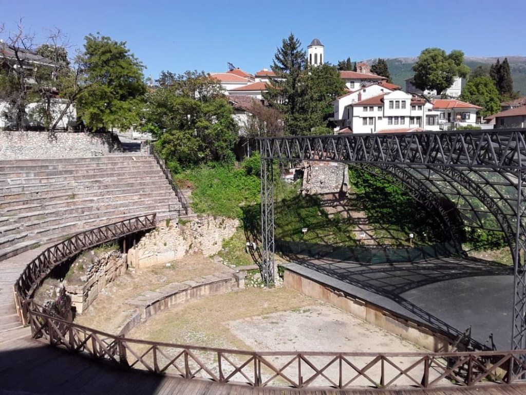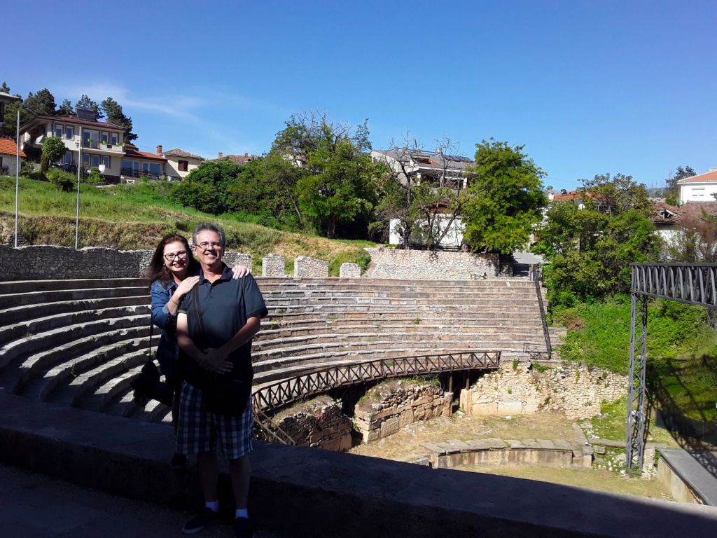 O Anfiteatro Grego fica ao pé da colina mais alta de Ohrid, abaixo da Fortaleza de Samuel, passando a Gorna Porta. Fomos caminhando e quando achamos que estávamos perdidos, topamos com ele. É do século II (ou seja tem quase DOIS MIL anos!) e foi erguido para apresentações de teatro, música e poesia. Quando os romanos conquistaram a região, em 148 a.C., ele foi adaptado com uma arena para batalhas de gladiadores e animais selvagens. Assim, vários dos assentos da fileira inferior foram demolidos para a construção de gaiolas e lugares de honra para os nobres. Mesmo sendo um sítio arqueológico, ainda é utilizado para apresentações, principalmente no verão.
