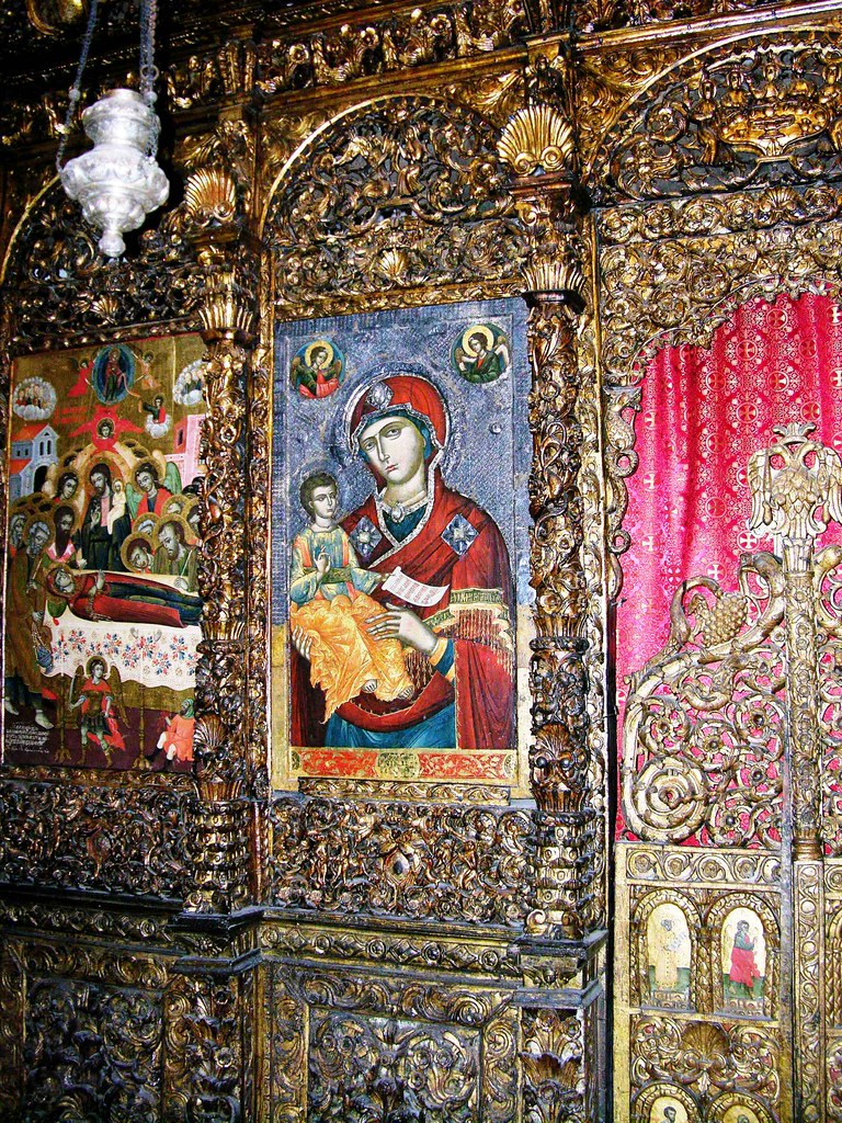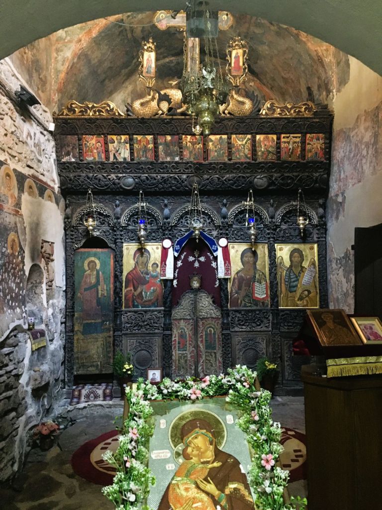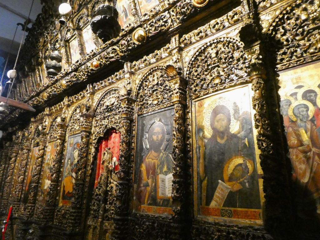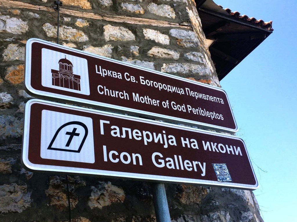 A Igreja da Mãe de Deus Peribleptos (de 1295) e o Museu dos Ícones ficam quase em frente à Gorna Porta, pertinho do Villa Kale. Fomos para lá logo cedo no dia seguinte à chegada. Ela é dedicada à Virgem Maria e “perivlepta” significa aquela que tudo vê, tudo ouve e tudo sabe. Lá estão os tesouros da iconografia medieval da Macedônia. Durante a Segunda Guerra as famílias locais esconderam os ícones sagrados dos nazistas, em suas próprias casas, mas, infelizmente, muitos foram levados. Ainda assim, trata-se de uma das coleções de arte bizantina mais importantes do mundo, com exemplares do século XII, de valor inestimável.