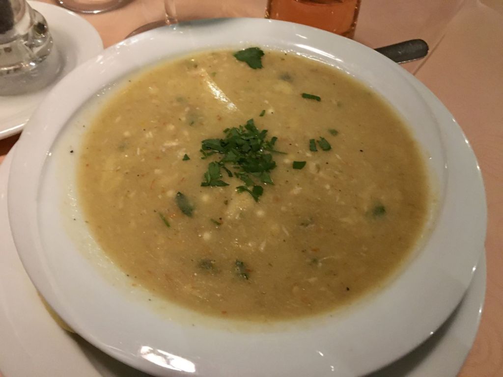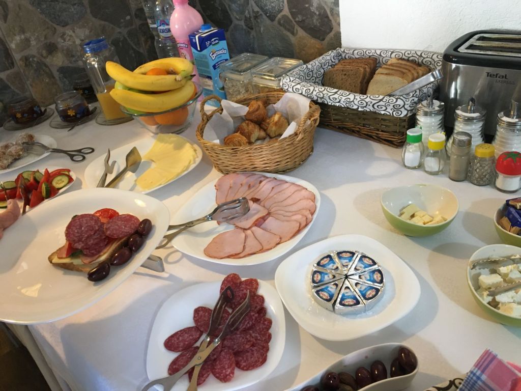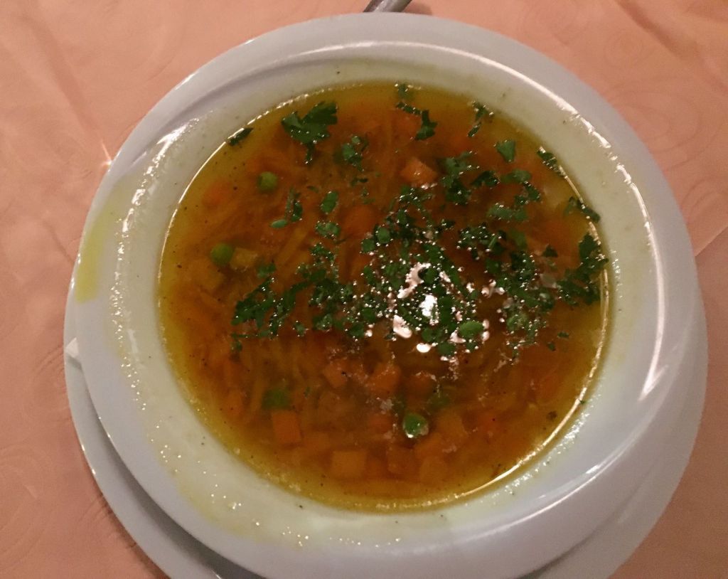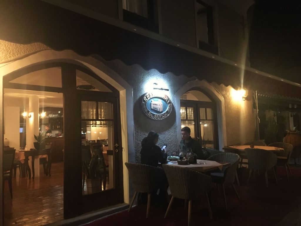 Como chegamos tarde e bem cansados, (afinal foram 7 horas de viagem!) mesmo com fome resolvemos tomar um banho, tirar uma soneca e só dar um giro pelos arredores depois. Por recomendação do Sr. Stefan, descemos uns 100 metros para jantar no Sveta Sofija. Friozinho, ar da montanha, ideal para uma sopinha! Sopa de peixe, sopa de legumes, truta assada e uns bolinhos para acompanhar! Pedi achando que eram pierogue porque o nome era “pieroshki”, mas eram uns rolinhos de queijo tipo primavera, iguais aos que havíamos provado em Tirana. Comemos muito bem e decidimos voltar para o almoço!