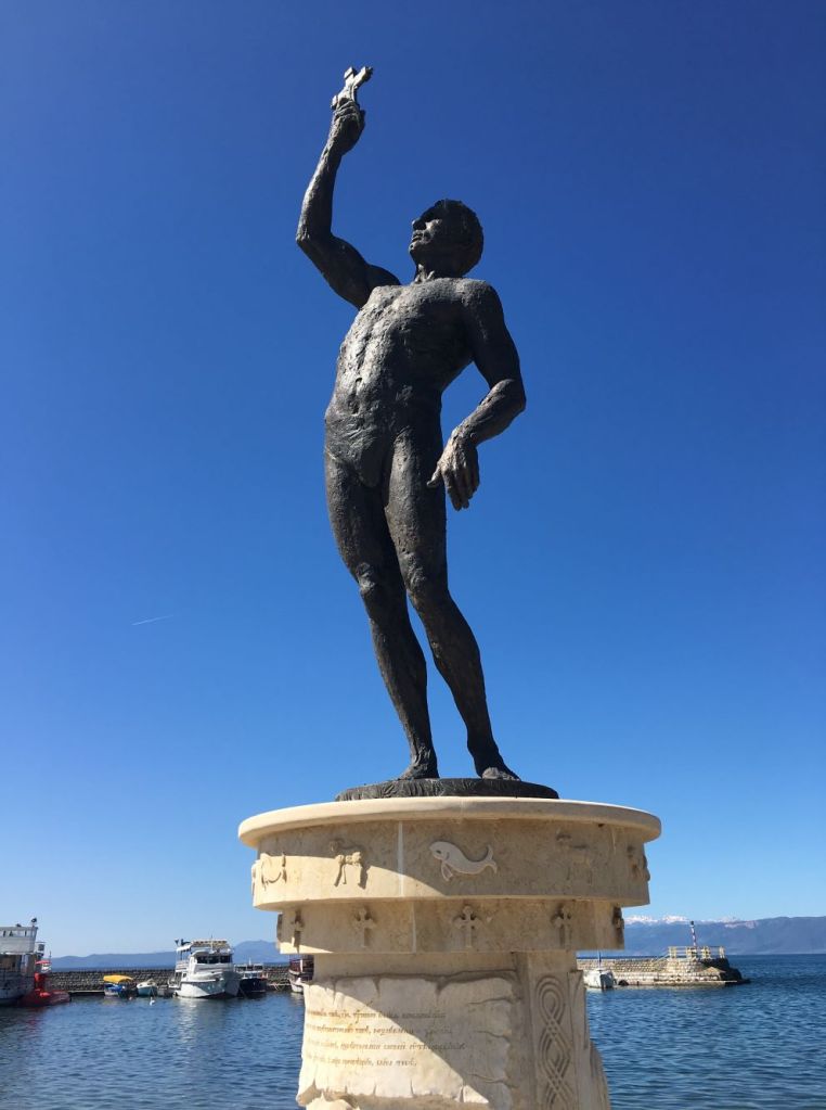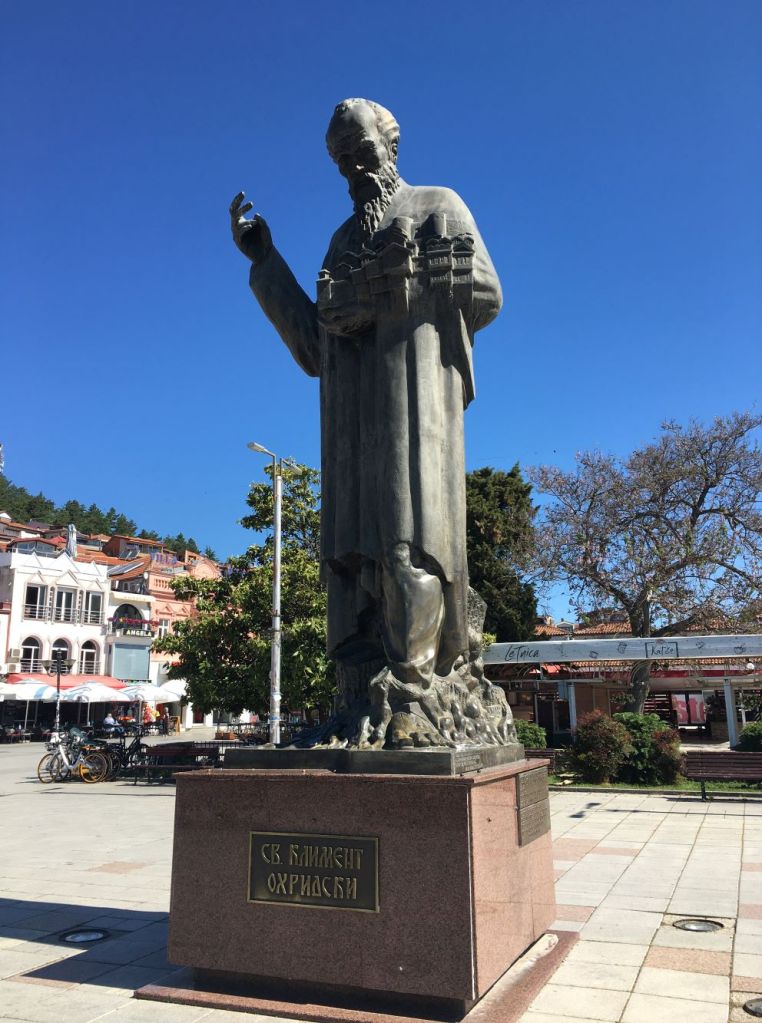 Descendo a Old Bazar até o final chegamos ao Promenade, o calçadão às margens do lago. Lá estão várias estátuas importantes para os macedônios como os santos Cirilo, Metódio, Clemente e Naum.