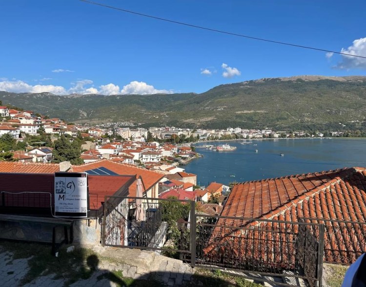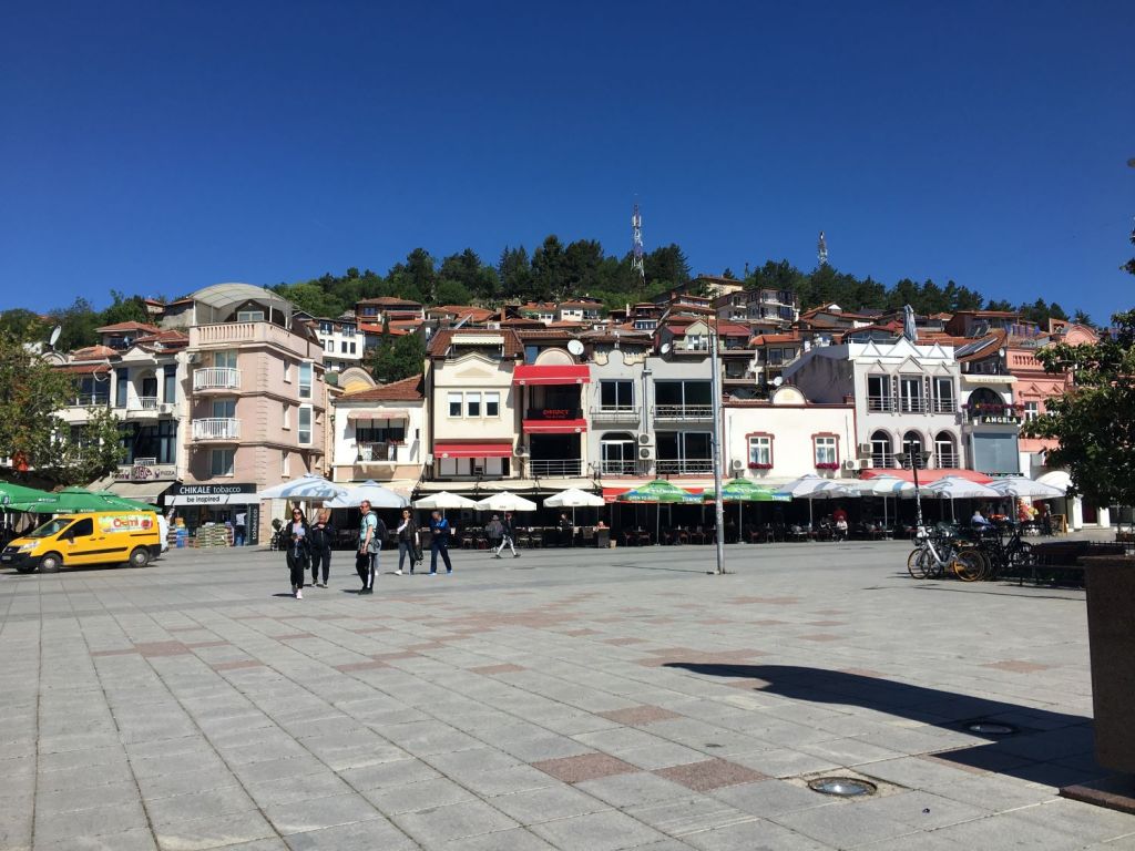 Embora tenha origens gregas, na Macedônia fala-se o macedônio, uma língua eslava. O alfabeto é o cirílico e muito do vocabulário é parecido com o sérvio e o búlgaro. Como nem na Sérvia e nem na Bulgária a gente conseguiu aprender nada, a comunicação foi em inglês mesmo. Em geral o pessoal fala bem mal, mas dá para atender os turistas com o básico. A moeda é o dinar e o câmbio é cerca de 1 real = 10 dinar, mas o preços são eurorizados e Ohrid é bem badalada, então não é tão barata.