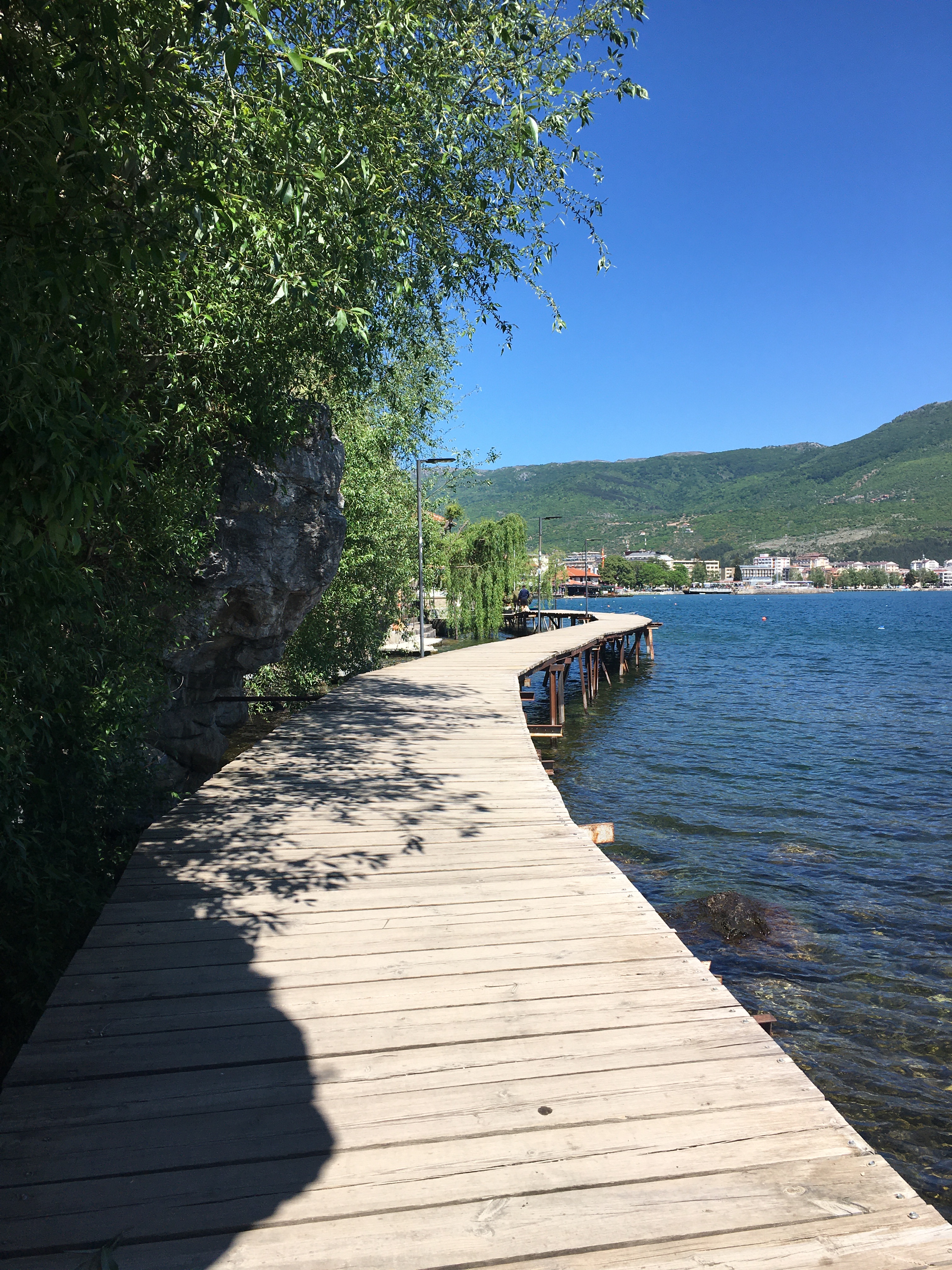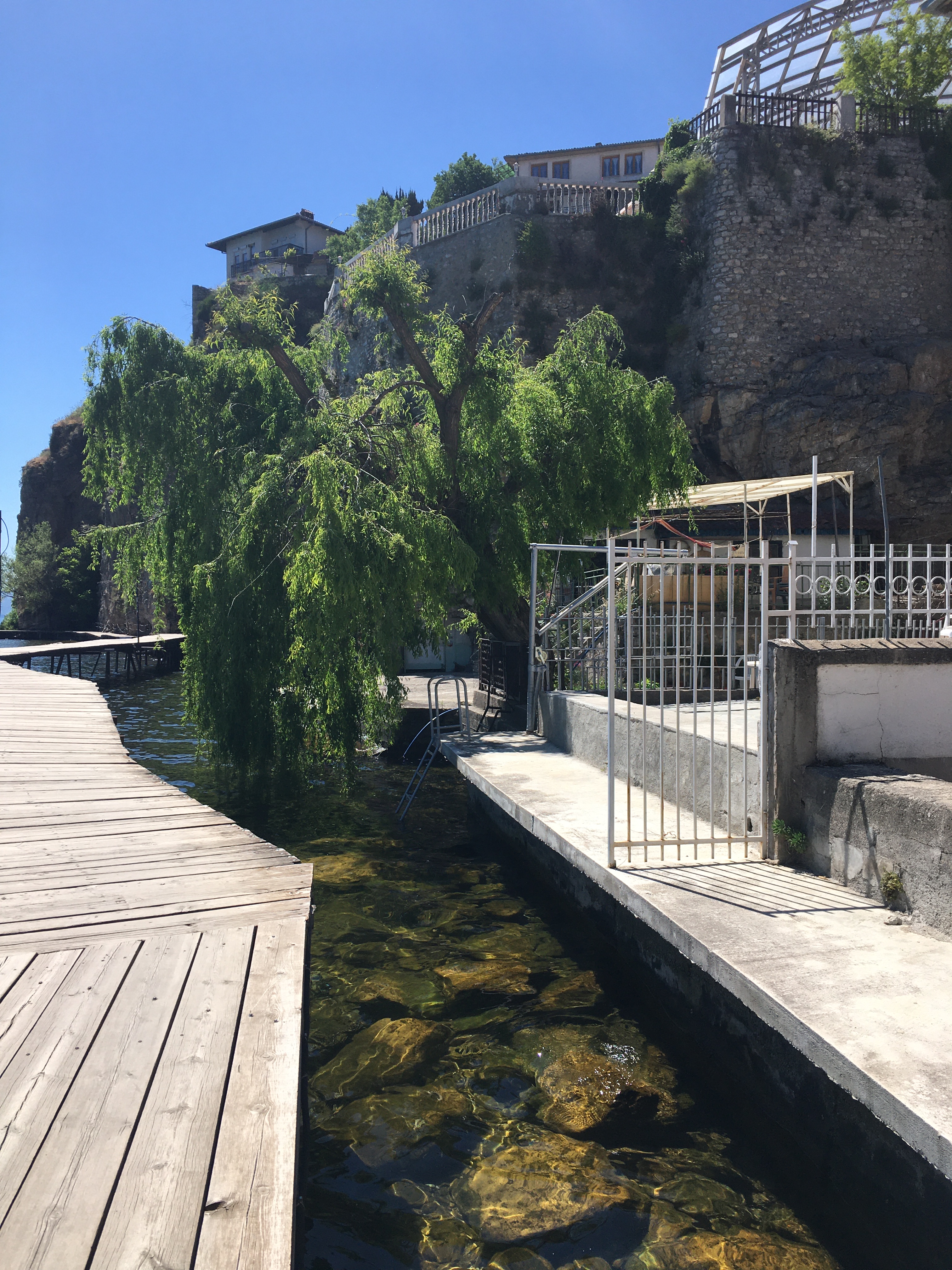 Só a vila dos pescadores em Kaneo já valeu a viagem para Ohrid! É um lugar mágico. Uma plataforma de madeira circunda o rochedo e dá passagem até o Promenade (o calçadão do centro comercial).