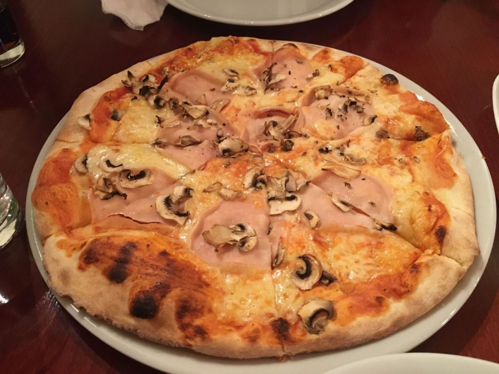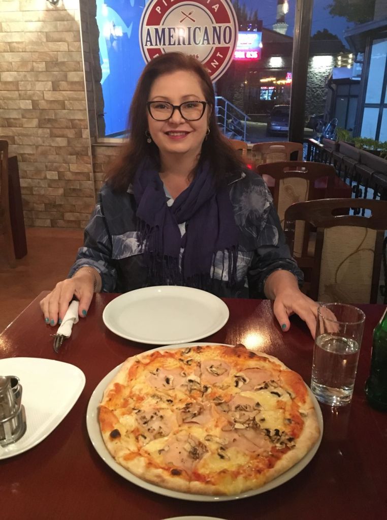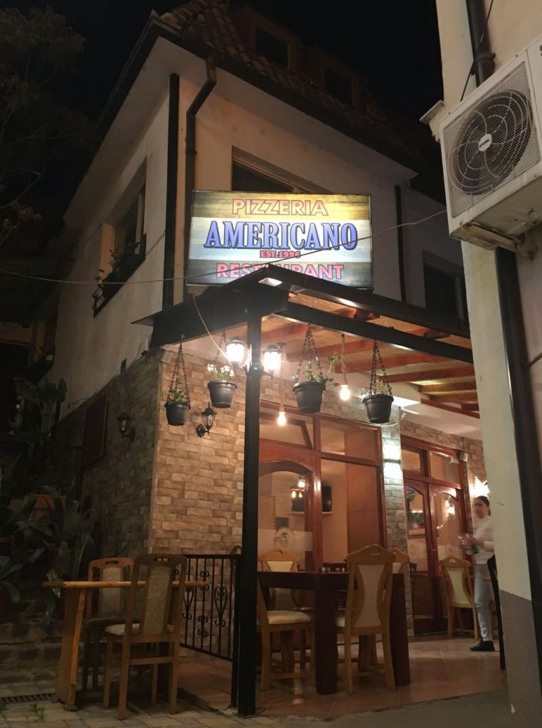 Segundo jantar na cidade, saímos ao anoitecer, demos uma boa volta por Mesokastro até a Old Bazaar e, subindo umas escadinhas, encontramos a Pizzaria Americano, na rua Argir Marinchev, nº 3. Lugar agradável e com bons preços. A garçonete falava um inglês razoável e foi bem prestativa. Não estávamos com muita fome, mas a pizza era grande e bem gostosa.