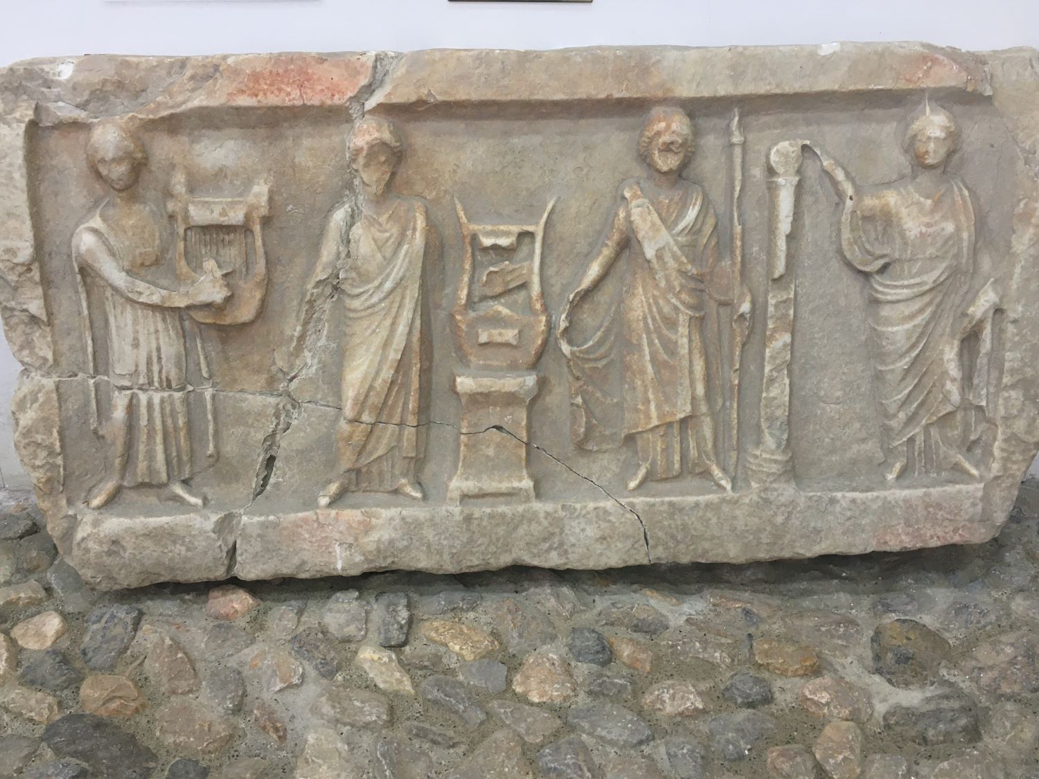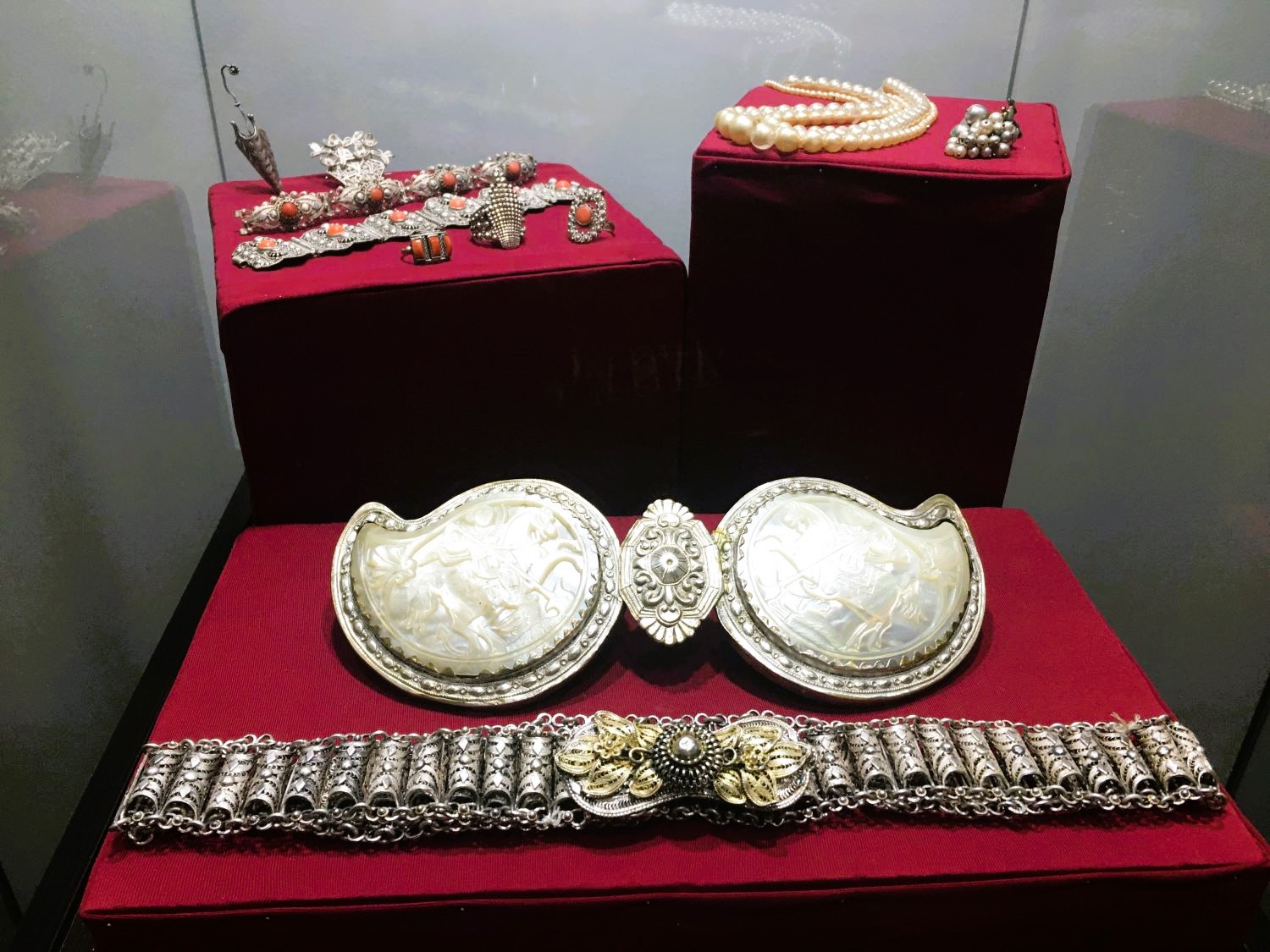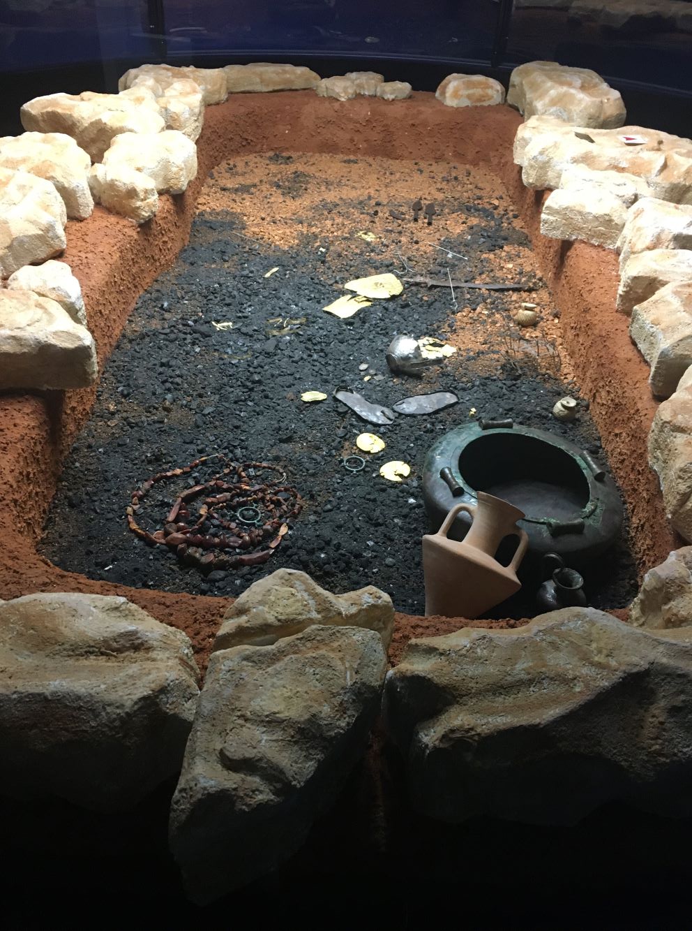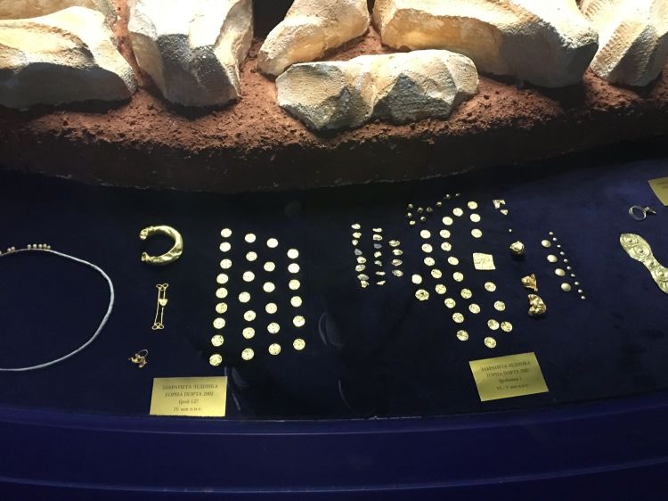 A principal peça é uma máscara funerária infantil toda em ouro, achada inteira! Foram encontradas somente três, uma delas está no Museu do Louvre, outra em Belgrado e apenas essa permanece aqui. Ela inclusive estampa a nota de 500 dinares.