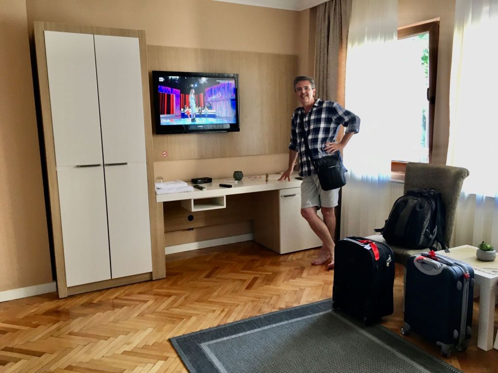Chegamos numa sexta-feira à noitinha no Prima, na Lidhja e Prizrenit nº 24, no centro histórico. Ele fica a apenas 300m da Praça Madre Tereza e bem em frente a um mercado e banca de frutas, o que sempre é útil. O quarto era bem grande, tinha uma pequena sacada, banheiro bom e chuveiro com muita água quente. O que foi uma glória porque estávamos cansados e só queríamos um bom banho e cama. Também tinha wi-fi gratuito para os hóspedes, embora no nosso quarto o sinal fosse fraco. Pagamos R$908,32 por 3 noites.