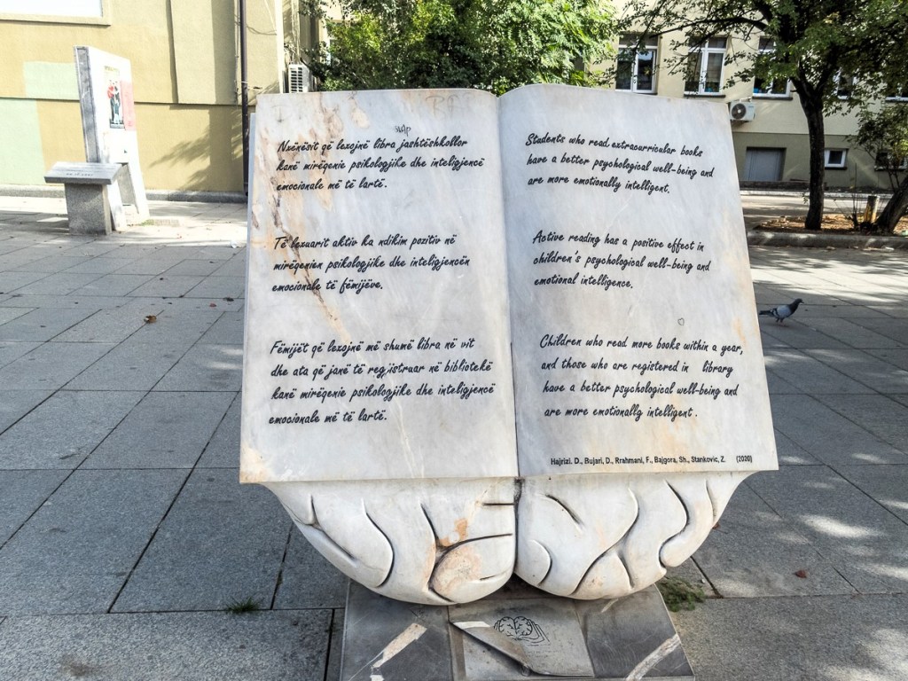 Pristina tem muitas livrarias… um sinal de que o país está em pleno desenvolvimento. Tem livraria tradicional, tem banquinhas de rua e tem café-livraria. Quer saber se um país está crescendo ou afundando? Veja se as livrarias estão abrindo ou fechando! Há até um monumento de incentivo à leitura que traz um estudo científico de 2020 sobre sua influência no desenvolvimento infantil.