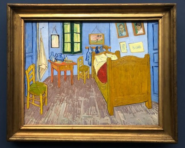 Kuitca criou um trabalho em diálogo com a emblemática pintura O Quarto. Em sua interpretação ele é amplo como um palco teatral, tem duas camas e numa delas alguém jaz. Vimos a terceira versão do quadro de Van Gogh (de 1889) no Muséee d´Orsay, em Paris e gostamos muito da versão desoladora do Kuitca.
